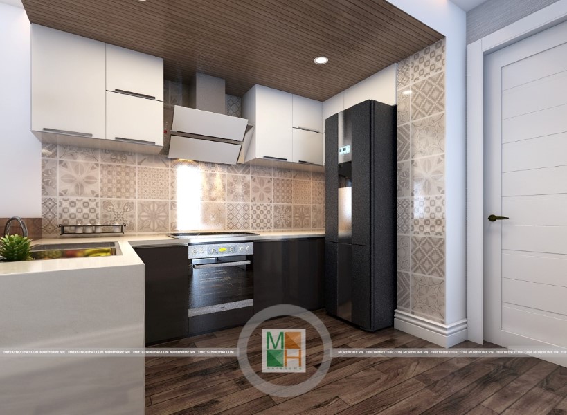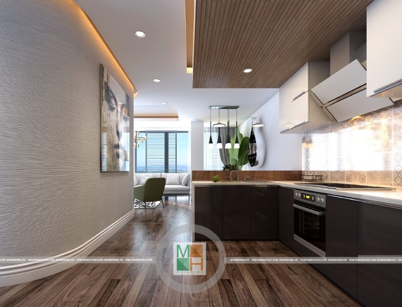 Phòng bếp với nội thất tủ bếp âm tường gỗ acrylic